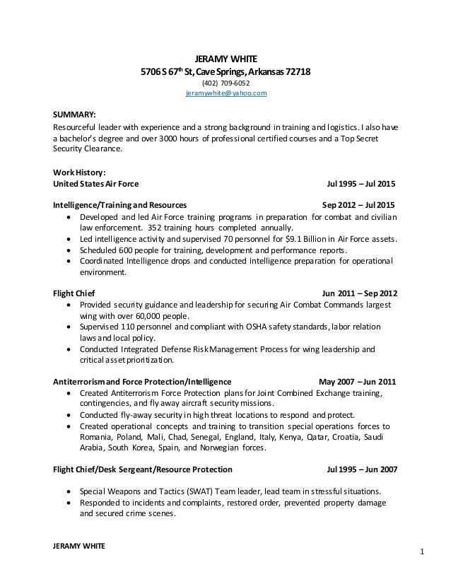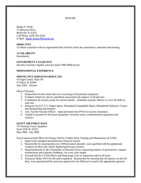 The U.S. Air Force Academy at Colorado Springs trains prepares young men and women to lead as Air Force officers. Air Force Officer Training School prepares selected personnel in the fundamentals of leadership; basic military skills; instills professional ethics; evaluates leadership... Do you need the best Security Forces resume? Check out real resumes from actual people. 20+ security forces resume samples to customize for your own use. United States Air Force, City of Victorville. Job Titles Held: Security Forces BDOC Controller, Life guard. secure account login. remembering account, browser, and regional preferences. remembering privacy and security settings. Some of the